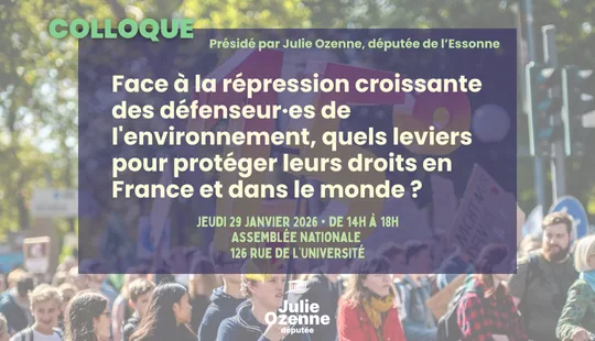 | COLLOQUE Jeudi 29 janvier 2026 • de 14h à 18h Assemblée nationale au 126 rue de l’Université Présidé par Julie Ozenne, députée de l’Essonne Face à la répression croissante des défenseur·es de l’environnement, quels leviers pour protéger leurs droits en France et dans le monde ? Si vous souhaitez y participer, n’hésitez pas à vous inscrire sur ce formulaire ⤵️ https://docs.google.com/forms/d/e/1FAIpQLSeLsPTkVFB18CB6aej8bN-mO2_v6dBOFisgxb8ircHZIGWlUA/viewform |